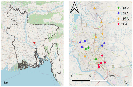 (a) Location of the study sites (Dhaka city center; red marked circle) on a map of Bangladesh, and (b) map of study area with different land-use categories. CA = commercial area, PRA = planned residential area, SRA = spontaneous residential area, UGA = urban green area.