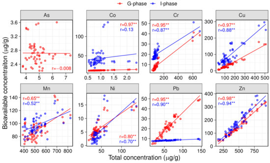 Scatter plot correlation for total concentration (µg/g) versus bioaccessible concentrations (µg/g) of toxic metals of roadside dust in Dhaka city. Double asterisk (**) designates statistically significant at p = 0.01.
