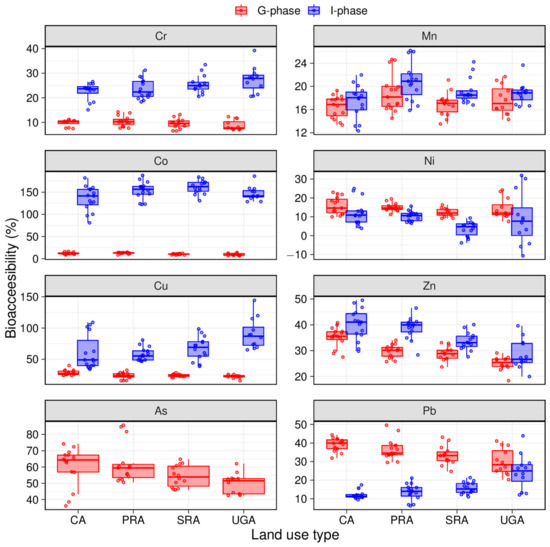 In this study, the average bioaccessibility percentage in the intestinal phase of the toxic metals was higher than the average for gastric phase bioaccessibility in all the land-use categories (Figure 4). Specifically, as mentioned in Figure 3, the bioaccessibility percentages of the toxic metals in the gastric phase had a similar sequence (As > Pb > Zn > Cu > Mn > Ni > Co > Cr) for CA, PRA, SRA and UGA. Among these, the bioaccessibility of As (for all the studied areas) and Pb (for CA) in the gastric phase was more than 40% of their total concentrations, indicating a relatively high health risk [49]. In addition, maximum As bioaccessibility found in the gastric phase suggested that As was more soluble in the gastric phase due to more acidic conditions (pH 1.5) when compared with the intestinal phase (below detection limit) [27]. According to Du et al. [50], Pb’s bioaccessibility was reduced considerably from the GP phase to the IP phase, which supported our results. This is because an increase in NaHCO3 in the IP phase may aid in the absorption of Pb into clay edges and the formation of Pb carbonate minerals [51]. Furthermore, pH has an effect on Pb bioaccessibility in the GP [24]. Cr showed the lowest bioaccessibility in the GP, which was similar to the findings in [25] where it was mentioned that Cr developed a residue form and was not easily absorbed by human gastrointestinal fluid [39]. On the other hand, the bioaccessibility percentages of the toxic metals in the intestinal phase were in a similar order to those in PRA and SRA (Co > Cu > Zn > Cr > Mn > Pb > Ni), but had a dissimilar order to those in CA (Co > Cu > Zn > Cr > Mn > Ni > Pb) and UGA (Co > Cu > Zn > Cr > Pb > Mn > Ni). Among these studied toxic metals, Co obtained the maximum percentage of bioaccessibility in the IP phase. However, in the IP, the percent bioaccessibility of Co and Cu was close to or greater than 100%, implying that the simulated solution was at least as effective in solubilizing these two metals. Moreover, the percent bioaccessibility of Cu increased from the GP phase to the IP phase which is consistent with the findings in [25,52] and suggests that a near-neutral pH of IP enhances the solubility of Cu. Moreover, as the pH of the solution increases from 1.5 to 7.0, the Cu in the solution forms an uncharged complex, Cu(Gly)2, increasing Cu bioaccessibility in the IP phase [40]. Besides that, the physiochemical properties of dust and the interactions between toxic metals with road dust constituents can affect metal bioaccessibility [24,53]. For example, Zn bioaccessibility (GP) is influenced positively by organic matter (OM) and adversely by cation exchange capacity (CEC) [24]. Comparing the mean percent bioaccessibility with the GP and IP phases in different land-use areas, As, Co, and Cu showed relatively high levels, suggesting a relatively high health risk after ingestion although As and Co presented low total concentrations in the roadside dust of Dhaka city (Table 2). Cr, Zn and Pb, Ni, and Mn also had considerable levels of bioaccessibility in the human gastrointestinal tract, and their health risk could not be omitted. The mean bioaccessibility of Cu, Zn, and Pb in the GP and IP phases were significantly varied among the different land categories, indicating that the bioaccessibility of toxic metals (Cu, Zn, and Pb) has spatial variability, while Cai et al. [23] found no significant variation in toxic metal bioaccessibility in different functional areas. The bioaccessibility of Pb displayed functional area distribution characteristics in the urban dust of Hangzhou, China, according to Zhang et al. [26]. The bioaccessibility of Pb was mainly dominated by the total Pb concentration, which was similar to our findings for the GP and IP phase. However, Pb bioaccessibility in the IP phase might be reduced by calcium concentration [54], and Han et al. [55] suggested that Pb bioaccessibility depends on pollution sources and the sample matrix.
