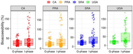 Bioaccessibility of gastric (GP) and intestinal (IP) phases in different land-use areas. CA = commercial area, PRA = planned residential area, SRA = spontaneous residential area, UGA = urban green area.