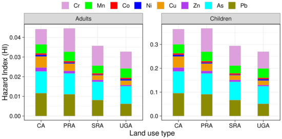 The bioaccessible concentrations of each toxic metal were used to assess non-carcinogenic (for Cr, Mn, Co, Ni, Cu, Zn, As, and Pb) and carcinogenic (for Cr, Ni, As, and Pb) risks in roadside dust so that a more accurate risk assessment could be conducted [56,57]. In this study, the health risks of toxic metals in the human body were assessed across the ingestion pathway for adults and children due to high exposure routes [58,59]. Dust containing toxic metals, when inhaled, can reach the gastrointestinal tract, where they are partially dissolved and then carried via the circulatory system and finally accumulate inside the body [60]. The non-carcinogenic health risks from exposure to toxic metals in roadside dust in different land-use areas in Dhaka city are presented in Figure 5.