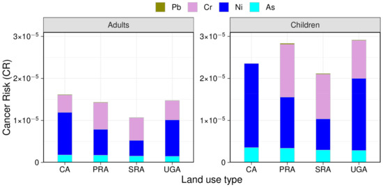 In this study, the carcinogenic risks posed by Cr, Ni, As, and Pb were investigated and the results are presented in Figure 6. On the other hand, the carcinogenic risks of Mn, Co, Cu and Zn were not calculated due to the lack of carcinogenic slope factor values in the ingestion pathway. The carcinogenic risk (CR) caused by As and Pb in roadside dust in various land-use areas of Dhaka city was found to be less than 1 × 10−6, indicating that there is no obvious serious risk from exposure to toxic metals for adults and children.