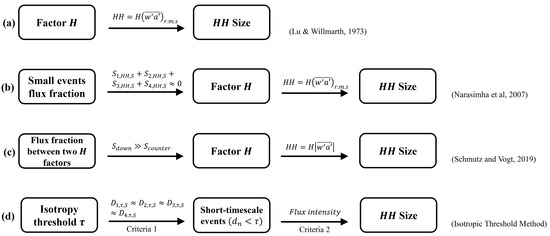 Illustration of the flow chart of 4 different methods, including (a) Lu and Willmarth [5]; (b) Schmutz and Vogt [8]; (c) Narasimha et al. [7]; (d) isotropic threshold method in this study, approaching to factor and hyperbolic hole in the quadrant plane.