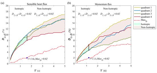 where and are quadrant number . As shown in Figure 5a, (dashed pink line) grows as the value increases. In the sensitive test of , maintains a relatively small standard deviation for while keeps the total short-timescale flux contribution result near zero. Flux contribution from each quadrant’s short-timescale event cancel each other out, which is also an isotropic feature to confirm the isotropy and similarity of these selected events. As value exceeds the solid black line in Figure 5a, the statistical similarity between the quadrants is considered to be vanished. The optimal s value for the example will include more isotropic events, which will lead to more accurate range of the flux intensity of short-timescale event, and more representative . For momentum flux, in Figure 5b, the and are larger than the and when < 2 s, this corresponded with the report by Schmutz and Vogt [8] with stated that a smaller-scale momentum sweep dominates the vertical exchange under unstable conditions. With the existence of , the minor difference between time fraction results of quadrant 2 and quadrant 4 can be tolerate until exceeds 0.02 and an optimal s is acquired for the momentum flux event.