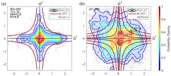The hyperbolic hole was first proposed by Lu and Willmarth [5], who defined the size of as the root mean square of the fluctuation and times a factor . In our research, the term of the equation changes to mean flux . Both definitions of the are commonly used in the relevant studies. Turbulent motions on the quadrant plane are separated into near isotropic small-scale events (i.e., ) and large-scale events (i.e., ). is the function of large-scale and small-scale motions,