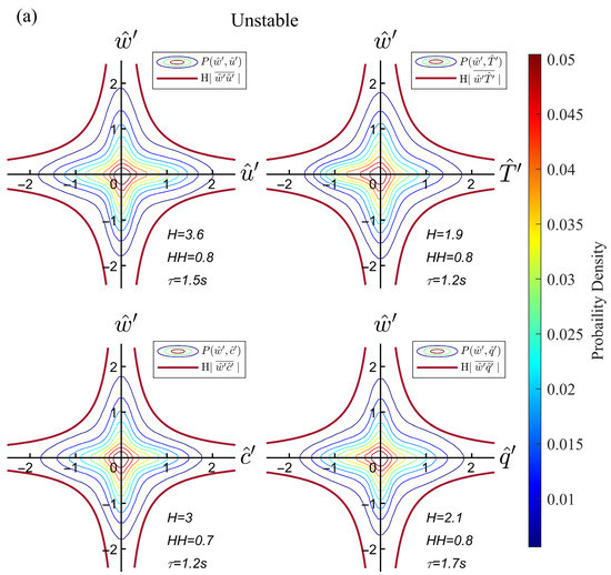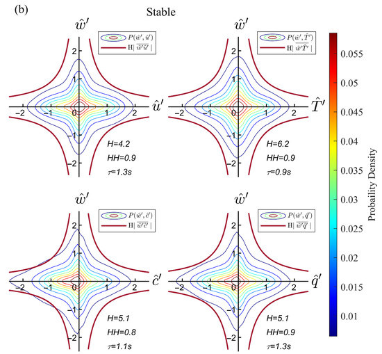 The average JPDF contours of the short-timescale events show excellent symmetry and are hyperbolic-like in the quadrant plane in both unstable and stable conditions. The density of the scatter regularly declines from the center outwards, invariant concerning rotations and reflections of the original system of coordinate axes [40]. In the Taylor frozen hypothesis, a certain number of independent locally isotropic events through the 3D anemometer were captured with threshold . The statistical average features of isotropic events are revealed with sufficient dataset length. As for the original data within the same hyperbolic hole, the average JPDF contour shapes are rhombus with four vertices on the coordinate axis, which are not hyperbolic. Therefore, merely discussing the factors and size cannot reveal the nature of the isotropic turbulence. By combining the time and flux information from the original data, we discovered a good resemblance between the contours of momentum, and thresholds, which resulted in different stabilities. The hyperbolic hole value is not sensitive to the stability changes, within a range of 0.7–0.8, while the factor varies from different stabilities. The covariances of momentum, sensible heat, carbon dioxide, and water vapor are different in previous studies [8,12], causing a difference in value. The similarity in values is a kind of isotropic feature shown in another way; that is, the range of the flux intensity of short-timescale events is the same for various stabilities and for all flux cases. The average values of momentum and are similar, while the sensible heat and fluxes’ are the same. The isotropic threshold range from 1.2–1.7 s in unstable conditions, 0.9–1.3 s in stable conditions. The timescales of isotropic events in unstable boundary layers are slightly larger, as Schmutz and Vogt [8] mentioned. However, the differences in stay within 1 s, which is sufficient to indicate that the results are near isotropy among the momentum and scalars with different stabilities. Because the short-timescale events match the isotropic features in many ways, this gives us strong confidence for the large-scale motion analysis in the next section.