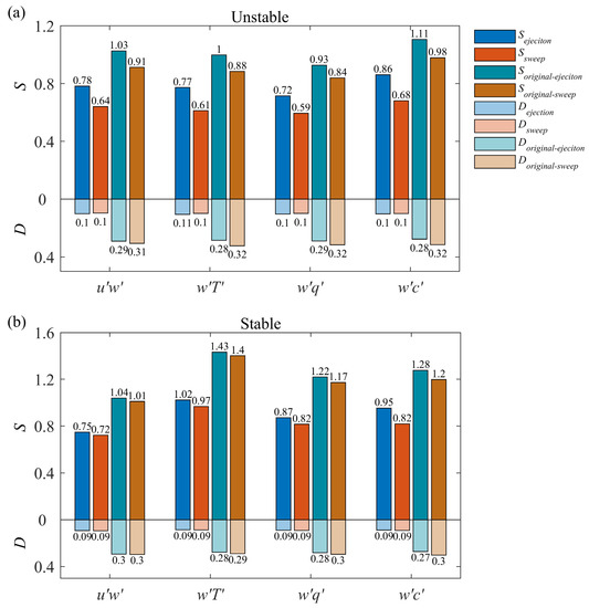 Under unstable conditions, the time fractions of ejections and sweeps differed for all variables, as shown in Figure 8a. With the original data, the time fractions of sweeps are larger than those of ejections, which is a known feature of many studies on different canopies and at different heights [8,12,15,28]. However, the time fractions of large-scale ejections are longer than those of sweeps, which implies that large-scale ejections are more active in the 30-min period. This is also explained by buoyancy-driven thermal plumes under unstable conditions. Under stable conditions, the time fractions of large-scale ejections and sweeps are equally active for momentum and scalar fluxes, at approximately 9%, which makes us wonder: are the large-scale motions transported simultaneously?