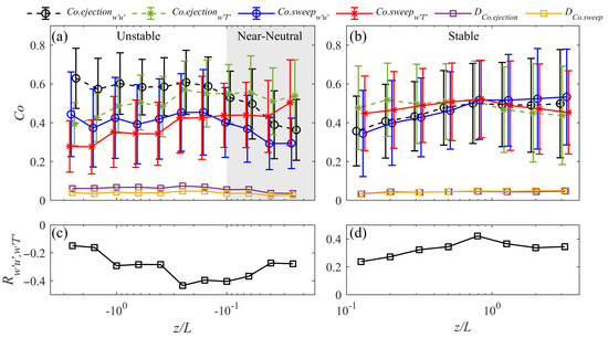 To further investigate the behaviors of same-time transport of momentum-scalar dissimilarity, we introduced the time fraction (purple line with squares) and (yellow line with squares) of the total synchronous flux transport. Under both unstable conditions in Figure 9a, where is approximately 6.6% and is approximately 4.1%, the co-ejection motions are more active than co-sweep motions owing to the upswelling enhancement of thermal plumes. In the last section, we discovered that the time fractions of large-scale ejections are longer than those of the sweeps under unstable conditions. Because of the more frequent appearance of the large upswell motions, in general, the co-ejection results are larger than the co-sweep results by 2%. Under near-neural conditions, where turbulent fluxes are nearly constant with height [28], the co-ejection and co-sweep motions have similar proportions of approximately 2–3%, while the values increase to 4.3% for and 4.4% for under stable conditions. Although the lack of near-neutral data are discussed in Section 2, the additional 40 runs of qualified near-neutral data are added here to complete the trend variation between unstable and stable results (grey area in Figure 9a where ). According to Schmutz and Vogt [8], the equal importance of sweeps and ejections under near-neutral and stable conditions is also shown in the and results, which indicates that the joint flux transport depended on the behaviors of the large-scale motions under the buoyancy-driven or mechanical-driven or weak gradient atmosphere conditions. However, except for near-neutral conditions, the co-transport time does not seem to be sensitive to the increase in stability or instability. Thus, what are the effects of the increase or decrease of correlations between momentum and sensible heat fluxes in those scenarios?