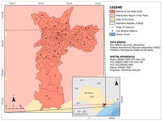 The city of São Paulo (Figure 1), located in the southeast region in Brazil, is the administrative capital of the state of São Paulo and acts as the central city of the Metropolitan Region of São Paulo (RMSP), which integrates 39 municipalities. The city of São Paulo has more than 12 million inhabitants and is 1521 km2 [36]. It is divided into 96 districts, which are administratively grouped into 32 sub-municipalities (Table 1).
