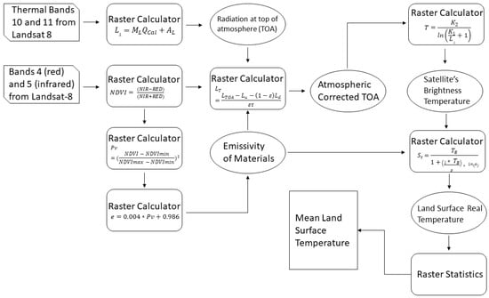 Finally, using the cell statistics tool with input as the LST of thermal bands 10 and 11, it was possible to obtain as output the mean value of the land surface temperature for the two respective dates. The flowchart of the procedures can be seen in Figure 3.
