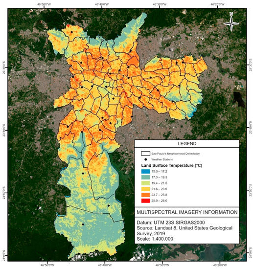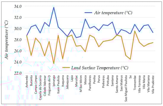 The air temperature was obtained from the 29 weather stations of the CGE within the city of São Paulo. From the measurements, which are taken every 10 min, it was obtained the hourly mean corresponding to the instant at which the Landsat-8 satellite images were obtained, that is, the mean air temperature of 1:00 p.m. and 1:10 p.m. In this way, it is possible to cross-compare the LST values with air temperature, as shown in Figure 4 and Figure 5.