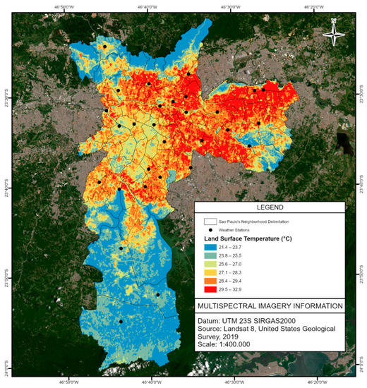 Comparing the present LST mapping with the one presented in the 2002 Environmental Atlas of the City of São Paulo is possible in order to verify that the central–west–south axis upscale neighborhoods have maintained their mild temperatures since the years of 1999/2000, including areas with high urban density. In contrast, the urban heat island has been expanding to the East Zone, North Zone, and South Zone, sometimes invading areas that previously belonged to State Parks, permanent protection areas (APPs), and environmental protection areas (APAs) [26].