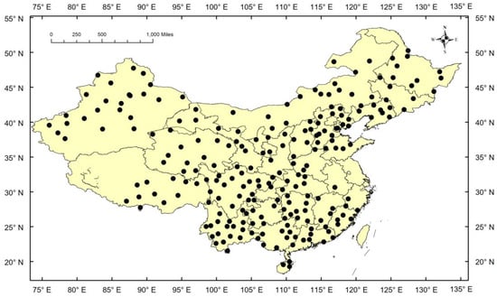 There are many meteorological data stations in China, but they are not evenly distributed. There are fewer meteorological data stations in the peripheral areas, with greater density in the central area. The selected sites are generally distributed across the whole of China, but some regions do not have data in this period, including Henan, Jiangxi, and Shanghai. The location of data stations in each province is not uniform, but the whole region can be represented by interpolation. In order to display the station locations, the distribution of the data sites on a map is shown Figure 1.