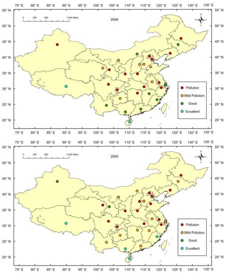 According to the number of clusters divided into groups to study the situation of each region, the spatial coverage of each region (including the cities) is counted. Then, the API of the classified cities is analyzed, which is helpful to discover the commonness of regional pollution. In the analysis of the classification of cities from 2008 to 2012, the data were also divided into four categories: polluted, slightly polluted, good, and excellent. The main factors to be considered are the concentration of SO, NO, and PM. According to the concentration of these three, the cluster analysis of the provincial capital city is performed. In order to see the pollution classification of each provincial capital city studied, we generated a detailed explanation from the spatial location distribution and specific classification.