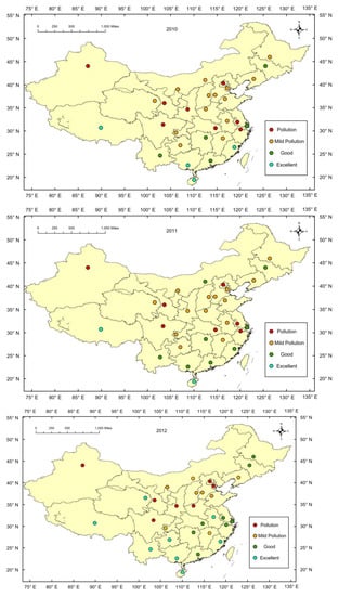 The clustering results of different years are different from the above tables, but the overall difference is not significant. Beijing, Chengdu, Lanzhou, and Harbin belong to the same category every year; all belong to the pollution category. Haikou and Lhasa are the two cities with better quality. Hefei, Shijiazhuang, Xi’an, Zhengzhou, and Chongqing are less polluted. Based on the results, this paper classified all cities into four groups shown in Table 6. From the perspective of classification, by 2012, the proportions of all kinds of pollution were in a concentrated state, and the proportion was around 25%.
