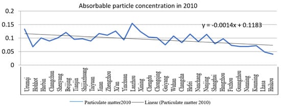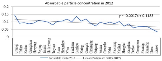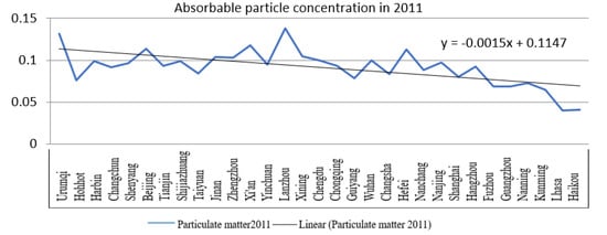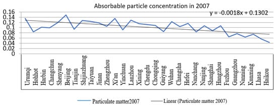 The hypothesis was that the mean concentration of absorbable particulate matter was relatively high in the middle part of China and relatively low in the coastal and marginal areas. Due to more rainfall and wind, absorbable particles cannot easily gather in coastal areas and are easily blown away by rain or wind. In order to prove our hypothesis, the line chart of the concentration of particulate matter from each provincial capital city is drawn in the order from north to south and from inland to coastal. The concentration of particulate matter can be absorbed after trend analysis. The diagram shows that each year, the trend in the figure, the slope, is negative, proving that the above hypothesis is correct. On the other hand, the slope from north to south and inland to coastal did not change much from the selected years of 2007 to 2012 as shown in Figure 3, Figure 4, Figure 5, Figure 6, Figure 7 and Figure 8.