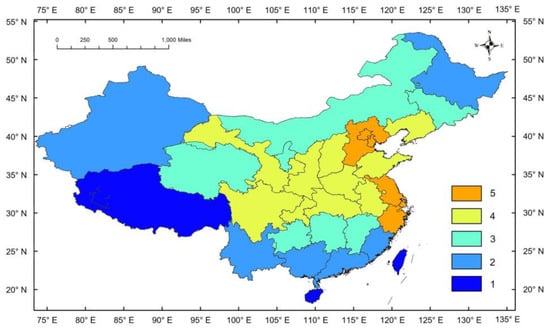 In order to further observe its clustering effect, the annual data were analyzed by clustering. After many experiments, the clustering result was better when the k value reached 4, and the spatial boundary was the clearest. Because we are trying to find out the spatial and temporal characteristics of the clustering results, we focus on the characteristics of cities in different spaces or the clustering results over time. After the completion of clustering, different city points will be divided into different categories, and each city has an additional attribute of a category.