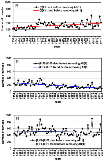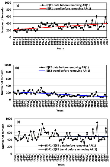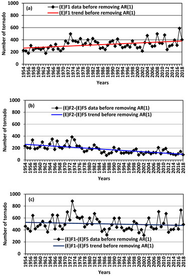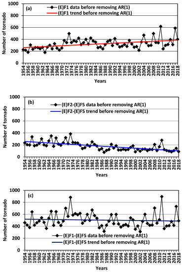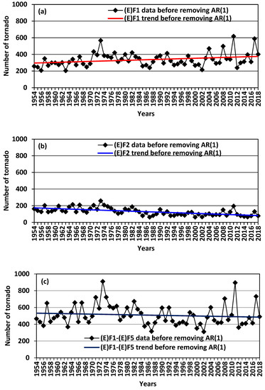 Time series of U.S. tornado counts (1954–2018) and its trend before removing AR(1) for. (a) (E)F1 tornado, (b) sum of (E)F2 to (E)F5 tornado, and (c) sum of (E)F1 to (E)F5 tornado.