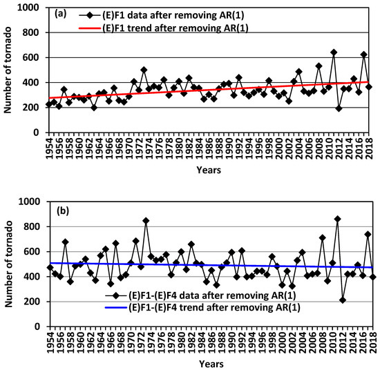 Time series of U.S. tornado counts (1954–2018) and its trend after removing AR(1) for. (a) (E)F1 tornado, and (b) sum of (E)F1 to (E)F4 tornado.