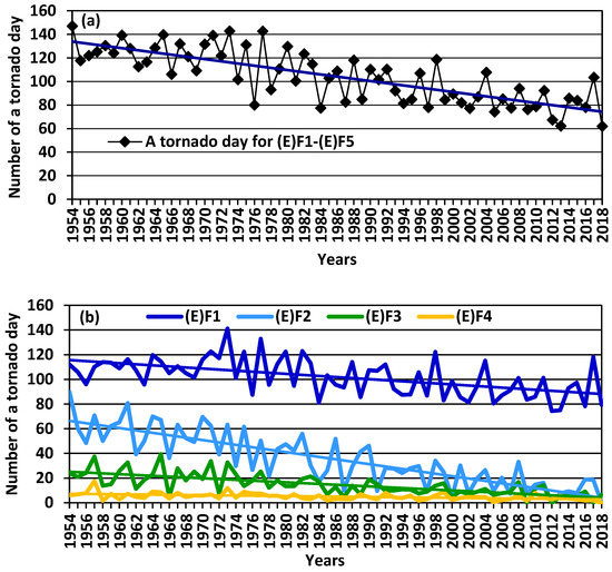 Number of a tornado days (1954–2018) and its trend after removing AR(1) for (a) sum. of (E)F1 to (E)F5 tornado days and (b) individual (E)F1 to (E)F4 tornado days.