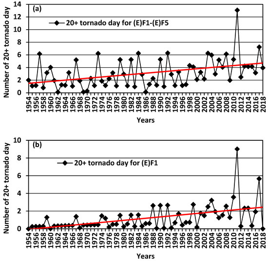 For tornado days with a high frequency of occurrence (e.g., 10+, 20+, 30+, 40+, and 50+ tornadoes per day), (E)F1–(E)F5 tornado days have positive trends, in which 10+ and 50+ tornado days pass a statistical test at the level of 95%, and 20+, 30+, and 40+ tornado days pass a statistical test at the level of 99%. For 20+ tornado days, for example, (E)F1–(E)F5 tornado days have a positive trend (Figure 8a) contributed by a positive trend of the (E)F1 tornado day (Figure 8b), and both positive trends are statistically significant at the level of >99%. Our results show that (E)F2, (E)F3, (E)F4, and (E)F5 tornado days are not statistically significant. Similar results were obtained for 10+, 30+, 40+, and 50+ tornado days, with positive trends for both (E)F1–(E)F5 and (E)F1 tornado days at the statistically significant level of >95%. This indicates that the increase of tornado days is toward the high frequency phase, which is mainly contributed by the (E)F1 tornado day. On the other hand, the research in [12] pointed out without statistical tests that the high-frequency tornado days tend to have a higher proportion of stronger tornadoes, such as (E)F3.