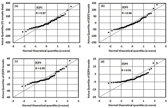 To be able to perform proper computations based on Equation (17), one needs to verify if the residuals (i.e., the deviations about a linear trend b) obey a normal distribution. To confirm this, we plotted quantile–quantile (Q–Q) plots [28] for (E)F1–(E)F4 tornadoes. As displayed in Figure 9, there are excellent linear relationships between actual quantiles of (E)F1–(E)F4 tornadoes and normal theoretical quantiles. The correlation coefficients are 0.97, 0.96, 0.95, and 0.91 for tornadoes (E)F1, (E)F2, (E)F3, and (E)F4, respectively, and all are statistically significant at a level of at least 99.5%. Therefore, the residuals for the tornadoes (E)F1–(E)F4 obey the normal distributions and applications of Equation (17) based computations to tornadoes (E)F1–(E)F4 are well justified.
