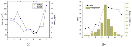 The trends of monthly average relative humidity (RH) and precipitation (meteorological data and PM2.5/10 from https://quotsoft.net/air/ (accessed on 14 July 2021) in recent years in Beijing are shown in Figure 1a, showing a single-valley trend. It can be seen that the precipitation in summer is very sufficient, with the highest occurring in July at about 190 mm, followed by autumn at about 35–50 mm. Precipitation is low in spring and winter, especially in December, January and February. The average monthly precipitation is less than 10 mm, resulting in low RH in winter. Obviously, the change in RH is positively correlated with the change in precipitation.