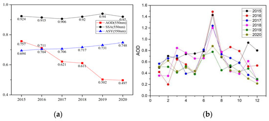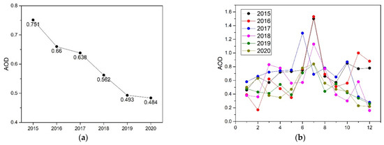 Description of MODIS AOD at 550 nm: (a) annual change trend graph of AOD; (b) monthly change trend graph of AOD from 2015 to 2020.