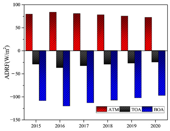 Figure 3 shows the trend of changes in ADRF from 2015 to 2020 in Beijing. The data come from https://aeronet.gsfc.nasa.gov/ (accessed on 16 July 2021). ADRF at the ATM varied from 72.52 W/m2 to 83.82 W/m2. Overall, there was a downward trend, which indicates that the aerosol radiative effect reduced the heating effect on the atmosphere. A positive value of ADRF at the ATM indicates that aerosols can absorb solar radiation and warm the atmosphere. The ADRF at the TOA and BOA varied from −97.51 W/m2 to −120.76 W/m2 and −24.99 to −34.96 W/m2. ADRF at the TOA is negatively expressed as the part of solar radiation that reaches the atmosphere and is reflected due to the presence of aerosols. Additionally, ADRF at the BOA can be understood as aerosols in the atmosphere that block solar radiation from reaching the surface and cool it down.