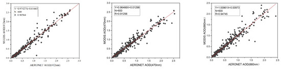 Verification of AOD for MODIS and AERONET at 412 nm, 470 nm and 660 nm.