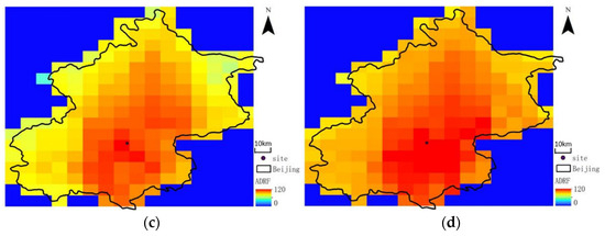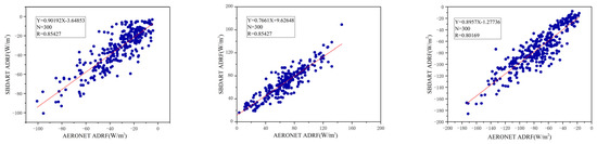 Figure 5 shows the results of ADRF calculated by SBDART and AERONET validation for TOA, ATM and BOA. The horizontal axis was derived from the data measured by AERONET, and the vertical axis was calculated by SBDART; both sets of data were matched in terms of time and space. Noteworthily, the accuracy of SBDART’s calculation of ADRF has been verified in many articles [34,35]. In the resulting 300 sample data, the comparison found that the correlation coefficient of all reached 0.8. A high correlation between them is shown; thus, the results from calculating ADRF using MODIS data and substituting SBDART are reliable. Therefore, calculating regional ADRF in Beijing is theoretically feasible.