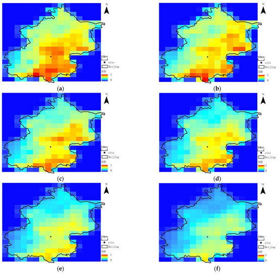 The distribution of AOD (412 nm) in Beijing from 2015 to 2020 (a–f).