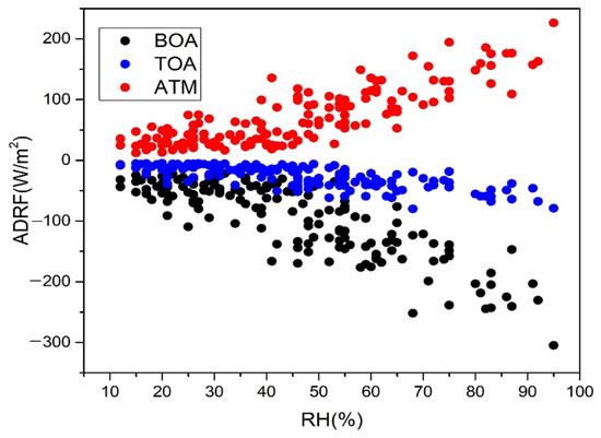 The aerosol radiative effect and changes in relative humidity under different degrees of pollution were observed from a complete set of data on air pollution events. Under slight to severe pollution conditions, the ADRF at the ATM had a positive correlation with the concentration of ground pollutants, with an average of 1 W/m2 that increased by 0.46 μg/m3. It was also positively correlated with humidity, with an average increase of 1.875% by 1 W/m2. At the same time, the higher the ADRF at the ATM, the higher the humidity [40].