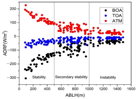 It can be seen from Figure 10 that ADRF and LHS showed a strong negative correlation. As the absolute value of ADRF increased, ABLH decreased, implying enhanced LHS. When the pollution was not severe, the aerosol radiative effect was not obvious, and the higher the ABL, the worse the LHS. The aggravation of pollution level leads to significant absorption and scattering effects of aerosols, cooling the surface and heating the atmosphere, reducing ABLH and thereby increasing the stability of ABLH. It is the continuous feedback effect between ADRF and LHS that allows the air pollution to continue. In particular, in the case of severe pollution, the ADRF at the ATM varied from 90 W/m2 to 200 W/m2, and the ABLH at this time was low, which can easily lead to a strong inversion layer with a thickness of 300~500 m [42]. When the inversion layer occurs, atmospheric turbulence movement is inhibited, especially vertical turbulence movement, resulting in unfavorable convective diffusion, enhancing LHS.