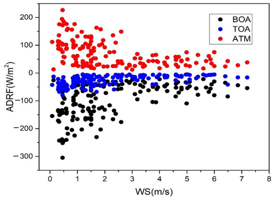 Figure 11 shows the negative correlation between ADRF and WS. The stronger the aerosol radiative effect, the higher the WS. The explosive growth of pollutants caused by persistently strong wind speed and the subsequent high aerosol loading had a dramatic impact on the radiation budget of the Earth’s atmospheric system [44]. The water vapor conveyor belt formed under the action of strong wind made the water vapor continuously transport to Beijing, which increased RH. Overall, the probability of pollution occurrence decreased with increasing wind speed, suggesting that pollution events mainly occurred in low-wind-speed conditions. It can be further seen that when the WS was less than 1 m/s, the aerosol radiative effect was more obvious, and the possibility of pollution in autumn and winter was very high. Generally, under the action of strong wind, this stable state can be broken, and the pollution incident can be ended [45].