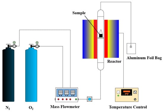 Figure 1 is the thermal desorption experimental system. The system is composed of gas distribution device, reacting device and tail gas collection device. The gas distribution device is composed of N2 and O2 gas cylinder and mass flowmeter, which can provide necessary N2 and O2 during the thermal desorption experiment. The reacting device consists of a vertical tubular furnace with a quartz tube reactor, and the reaction temperature in the furnace is accurately controlled through the temperature control system. A quartz tube reactor with the internal diameter of 50 mm is placed in the tubular furnace. The experimental sample placed on a quartz basket is located in the middle of the reactor. During the thermal desorption experiment, the tail gas is collected by an aluminum foil bag and sent to gas analyzer for detection.