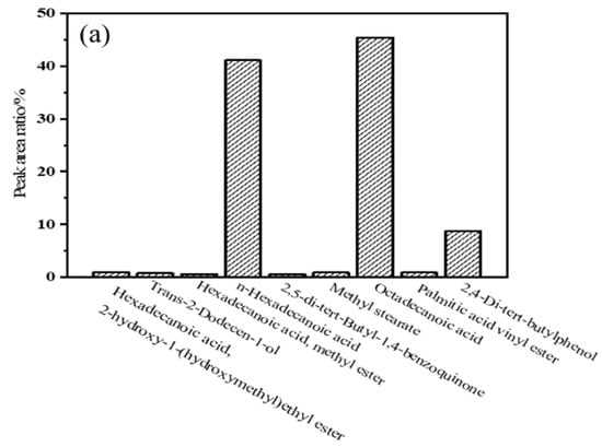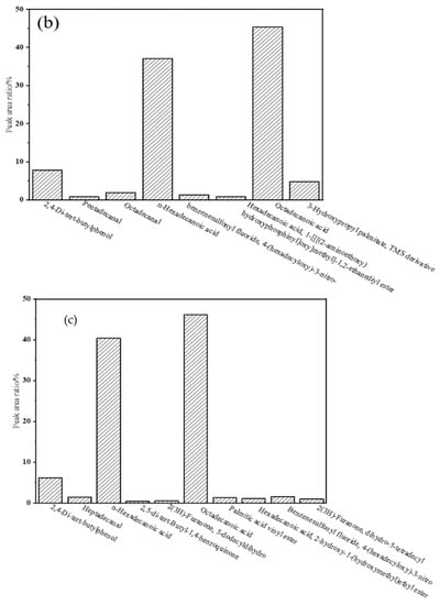 Figure 3 listed the macromolecular organic gas components emission from simulated polluted soil during thermal decomposition under N2 atmosphere at 500 °C. It suggested that the waste oil in the simulated polluted soils began to release in the form of macromolecular gaseous organic pollutants when the thermal desorption temperature was 500 °C. Among the macromolecular organic gas components, the content of octadecanoic acid (C18H36O2) and palmitic acid (C16H32O2) were relatively higher, especially for C18H36O2, the content accounted for 45.44%, 45.33%, and 46.09% during the thermal desorption of A1, A2, and A3 at 500 °C, respectively. As for C16H32O2, the content was accounted for 41.1%, 37.12%, and 37.12% during the thermal desorption of A1, A2, and A3 at 500 °C. However, the major composition of the released gaseous organic pollutants was quite different from that in the original waste oil, indicating that these substances were decomposed from the macromolecular organic matter in waste oil.