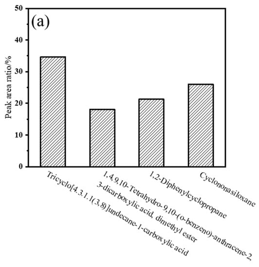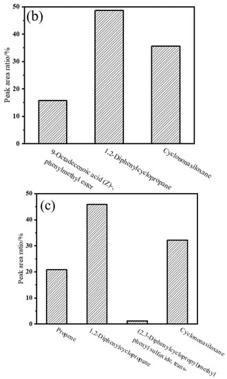 Figure 4 was the macromolecular organic gas components of different simulated polluted soils thermal decomposed at 600 °C. Compared with the components during thermal desorption at 500 °C, it can be seen that the substances produced by simulated polluted soil decomposed at 600 °C were quite different. The main substances were tricyclic [4.3.1.1 (3,8)] undecane-1-carboxylic acid, 1,2-diphenylcyclopropane, 9-octadecanoic acid, and propylene during the thermal decomposition of A1, A2, and A3 under pure N2 atmosphere at 600 °C. Moreover, a small amount of methylphenylsulfoxide was detected in the tail gas after the thermal decomposition of A3, indicating that more complex organic compounds were also desorbed from the soil with the increase of desorption temperature and the waste oil contained sulfur components. In addition, the siloxane detected by GC-MS in Figure 4 was provided for the detection system, not for the thermal desorption of organic components in simulated polluted soil. As for the condition of 21% O2/N2 at °C, macromolecular gaseous organics were not detected in the tail gas after thermal desorption of various simulated polluted soils, indicating that the gaseous macromolecular organics were completely burned and transformed into gaseous inorganic components as for the existence of O2 in the experimental condition.
