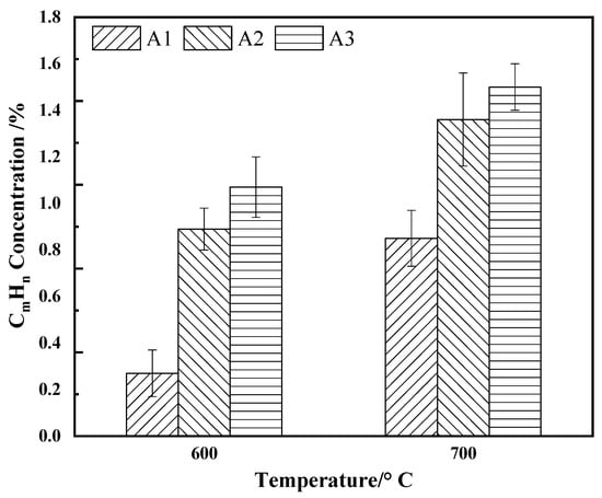 In order to verify that the gaseous macromolecular organic matter was whether further decomposed into small molecular organic pollutants in the process of higher temperature thermal desorption of simulated polluted soils or not, the small molecular alkanes thermally decomposed by simulated polluted soil in pure N2 atmosphere at 600 °C and 700 °C were analyzed by gas analyzer. As shown in Figure 5, with the thermal desorption temperature increasing, the content of small molecular alkanes (CmHn) in tail gas increased, and the maximum content was as high as 1.5%, which was the product of A3 thermal desorption at 700 °C. Moreover, with the increasing of mixed waste oil, the content of CmHn gradually increased, proving that with the increase of thermal desorption temperature, the released macromolecular gaseous organic pollutants were further decomposed into small molecular alkanes.