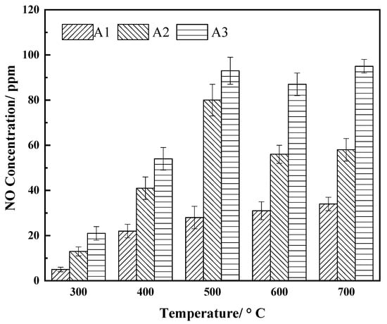 The concentration of NO during thermal desorption of simulated polluted soils under 20% O2/N2 atmosphere at different temperatures. (A1, sample of 1 mL waste oil mixed with 25 g soil; A2, sample of 2 mL waste oil mixed with 25 g soil; A3, sample of 3 mL waste oil mixed with 25 g soil).