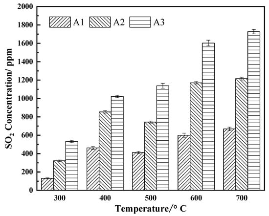 The concentration of SO2 during thermal desorption of simulated polluted soils under 20% O2/N2 atmosphere at different temperatures. (A1, sample of 1 mL waste oil mixed with 25 g soil; A2, sample of 2 mL waste oil mixed with 25 g soil; A3, sample of 3 mL waste oil mixed with 25 g soil).