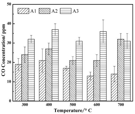 The concentration of CO during thermal desorption of simulated polluted soils under 20% O2/N2 atmosphere at different temperatures. (A1, sample of 1 mL waste oil mixed with 25 g soil; A2, sample of 2 mL waste oil mixed with 25 g soil; A3, sample of 3 mL waste oil mixed with 25 g soil).