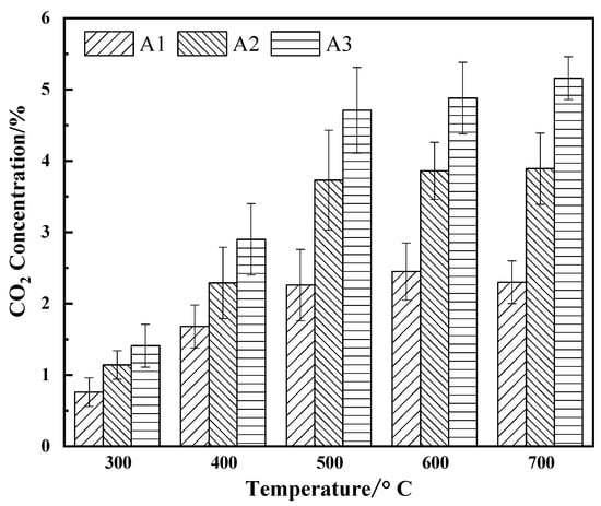 The concentration of CO2 during thermal desorption of simulated polluted soils under 20% O2/N2 atmosphere at different temperatures. (A1, sample of 1 mL waste oil mixed with 25 g soil; A2, sample of 2 mL waste oil mixed with 25 g soil; A3, sample of 3 mL waste oil mixed with 25 g soil).