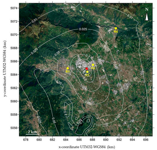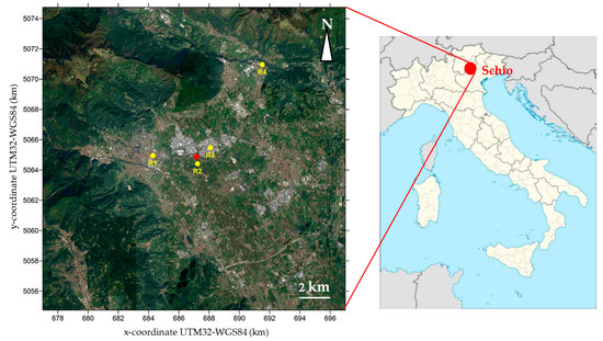Model simulations were performed over a 20 × 20 km2 computational domain centered on the plant location with a grid resolution of 125 m. In the UTM32-WGS84 system, the x-coordinate (West–East) ranges between 677 km and 697 km and the y-coordinate (South–North) ranges between 5055 km and 5075 km. For model simulations, additional discrete receptor points were located at the air quality monitoring station of Schio (R1: 684.28 km, 5064.95 km) and at sites where dedicated air quality monitoring campaigns have been performed (R2: 687.23 km, 5064.42 km; R3: 688.08 km, 5065.48 km; R4: 691.51 km, 5070.97 km). The modelling domain, including the plant location and the discrete receptors, is shown in Figure 1.