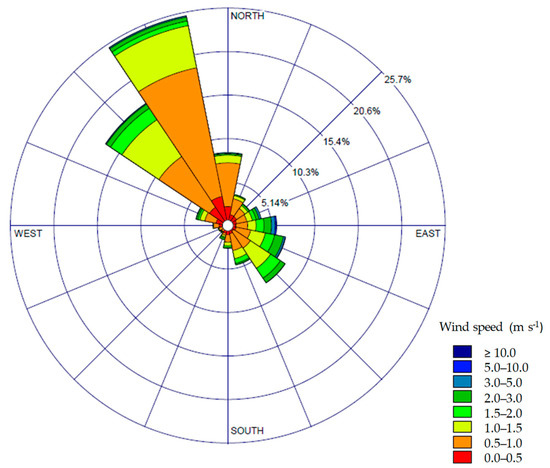 The ground-level (10 m) annual wind rose computed for the plant location (Figure 2) showed relatively weak winds (average speed of about 0.9 m s−1), mainly blowing from the North West quadrant (about 50% of the time) and in particular from the North West (about 16%), North North West (about 26%) and North (about 9%) sectors. Annual frequencies in the orders of 5–7% were observed for winds blowing from the south-eastern sectors, with a slight prevalence for the South-East sector. For all other directions, annual frequencies were of less than 3%, with almost no winds from the Western and South-Western quadrants. The wind roses at higher altitudes (Figure S2) substantially maintained the same features in the first four layers (up to 200 m from the ground level), but with gradual intensification of the wind speed (average speed 1.8 m s−1 a 160 m). At higher altitudes, the increase in the frequency of winds from North was first observed (200–300 m), and then the progressive clockwise rotation of the wind rose beginning in the 300–1000 m layer, characterized by the predominance of winds coming from the sectors around East.