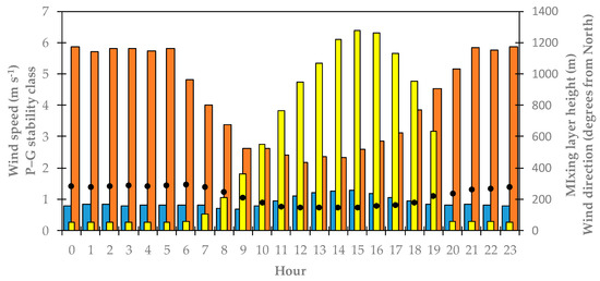 Average daily patterns of wind speed (blue bars, left axis), atmospheric stability (orange bars, left axis, P–G classes: class A = 1, class F = 6), wind direction (black dots, right axis), mixing layer height (yellow bars, right axis) for the simulation reference period.