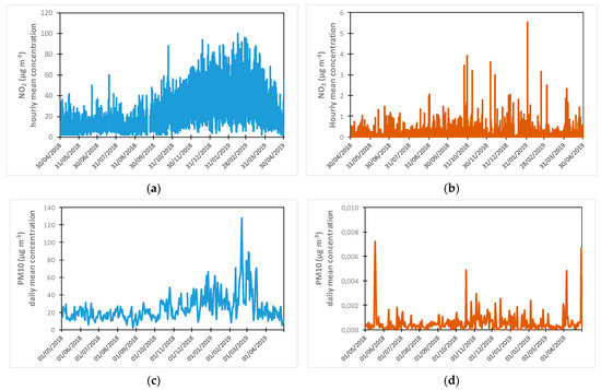 Time pattern of observed and modelled hourly NO2 panel (a,b) and daily PM10 panel (c,d) concentrations for the reference period (1 May 2018–30 April 2019) at site R1.