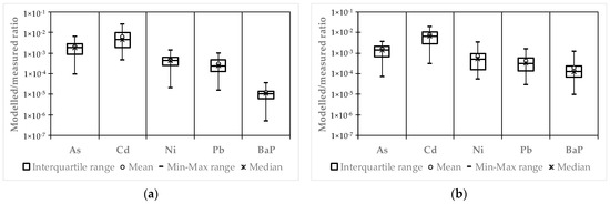 Except for As, for which the ambient data were always below the detection limit of 0.25 ng m−3, the concentration levels of the toxic elements displayed a strong seasonality, with cold season (Oct. to Mar.) levels roughly twice as high as in the warm season. In the cold season, the observed mean concentrations were 0.14 ng m−3 for Cd, 2.21 ng m−3 for Ni, and 5.07 ng m−3 for Pb; corresponding values in the warm season were 0.07 ng m−3, 1.44 ng m−3, and 2.93 ng m−3, respectively. These concentration levels were slightly lower than those reported in the literature in the vicinity of the Turin WtE plant [28]. The 2 × factor observed between the cold and warm season concentration levels is typical for the area as a consequence of the different atmospheric dispersion conditions. Conversely, the seasonality of BaP data was much stronger, with the cold season average at (0.31 ng m−3) about 15 times higher than the warm season (0.02 ng m−3), when the concentration levels were very frequently (44%) below the detection limit of 0.005 ng m−3. This seasonal pattern is mainly attributable to the extensive use of wooden biomass appliances for residential heating in the area, with a consequent strong contribution to BaP atmospheric presence that originated from its absorption of particulate emissions during colder winter conditions [29,30]. According to the results of a recent survey on the wooden biomass utilization for heating in the Po plain, in the Veneto region, where Schio is located, this type of fuel is used by an average of 30% users over a total population of nearly 2 million inhabitants [31], giving rise to essentially all of the BaP emissions observed for the area, alongside the other sources involved (industrial energy production, road transportation, manufacturing processes) [32]. Indeed, according to emission inventory data for the municipalities within the modelling domain, almost 97% of BaP emissions derive from the use of wooden biomass in the residential heating sector (Table S1).