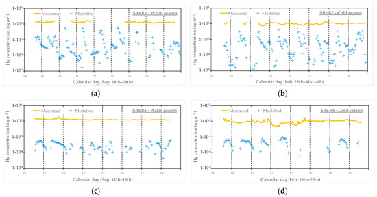 Time patterns of measured and modelled 1 h concentration of mercury (ng m−3) at site R2 ((a): warm season; (b): cold season) and R4 ((c): warm season; (d): cold season).