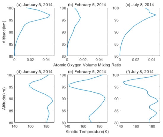 Figure 1b shows the altitude profile of the daily mean atomic oxygen volume mixing ratio at the equator for 5 February 2014. The atomic oxygen volume mixing ratio was between 0 and 0.017, with a peak of 0.0168 at around 96 km.